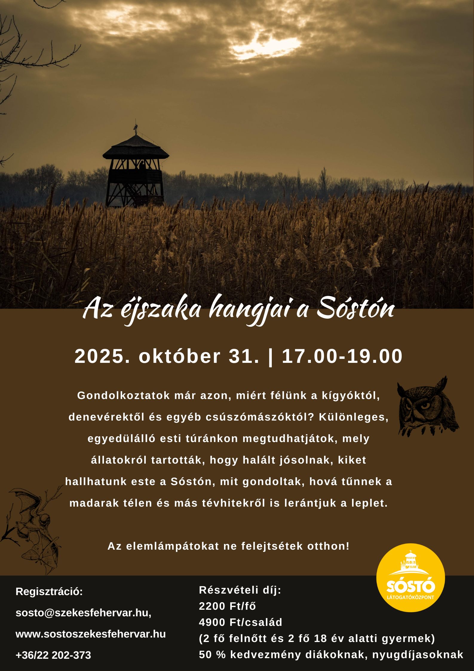 Gondolkoztatok már azon miért félünk a kígyóktól, denevérektől és egyéb csúszómászóktól? Különleges, egyedülálló esti túránkon megtudhatjátok mely állatokról tartották, hogy halált jósolnak, kiket hallhatunk este a Sóstón, mit gondoltak, hová tűnnek a madarak télen és más tévhitekről is lerántjuk a leplet.