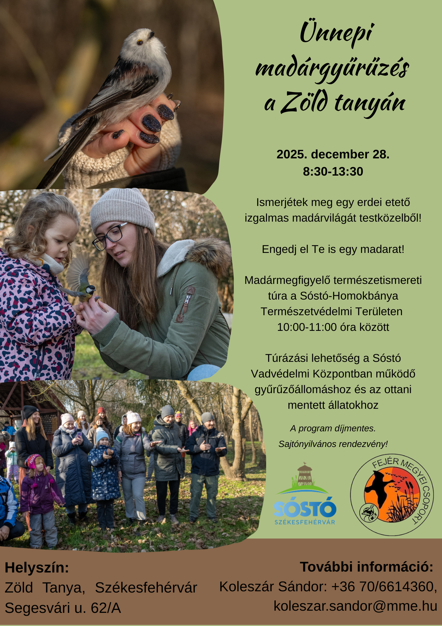 Az MME Fejér Megyei Helyi Csoportjának hagyományaihoz híven idén is várjuk az érdeklődőket a két ünnep között bemutató madárgyűrűzésre Sóstón, a Zöld Tanyára! A program díjmentes.
