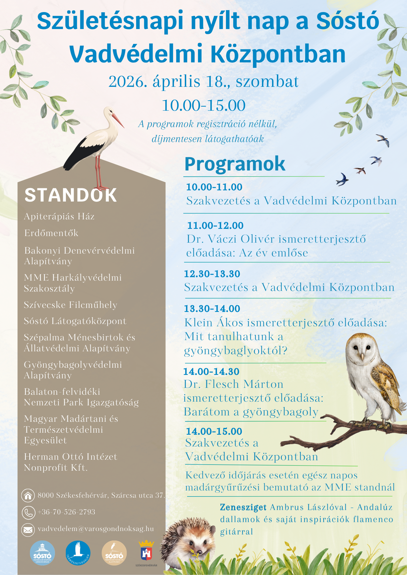 A Sóstó Vadvédelmi Központ nyitásának negyedik születésnapja alkalmából egy vidám, ingyenes családi nappal készülünk az érdeklődőknek. Ismeretterjesztő programok, interaktív standok, érdekes előadások, és madárgyűrűzés színesíti majd a nyílt napunkat. A programon lesz egy kis pihenőpont is, ahol lágy gitárszólamok mellett kapcsolódhatunk ki.